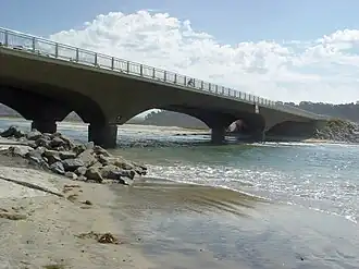 This new bridge is sometimes called North Torrey Pines Bridge,[32][33] although that same name is sometimes applied to the taller arch bridge immediately to its north.[34][35] This lower bridge over the lagoon inlet was built by Flatiron and cost $9,628,750.[32]