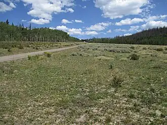 By the mid-1870s, mining in the San Juan Mountains resulted in the construction of trails and wagon roads connecting the increasing number of new mining camps and growing towns. In 1874 road builder Otto Mears constructed the Saguache and San Juan Toll Road which ran from the town of Saguache west over Cochetopa Pass to the Los Pinos Indian Agency and then on to the Lake Fork of the Gunnison River and Lake City. Authors have mistakenly described the path of this toll road as traversing Los Pinos Pass,[2] but Mears chose a more direct and less troublesome route from the Los Pinos Indian Agency to the Lake Fork. The toll road crossed the divide between the Los Pinos Creek and Cebolla Creek drainages near Summit Park, approximately 6 miles (9.7 km) north of Los Pinos Pass. This was a more direct route following another Ute trail that avoided the steep western decent from Los Pinos Pass and the narrow canyon of Cebolla Creek below. Lt. Ruffner's expedition followed this trail in 1873, and the Hayden Survey documented this route in 1874, the year the road was built. During this period Los Pinos Pass remained a trail suitable for foot and livestock travel.[3][4][5][6]