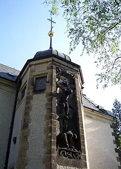 In 1893 a chapel was added, by the architect Friedrich Reuter. The stained glass windows are by Wilhelm Walther, the creator of the Dresden "Fürstenzug"; the scene of the Crucifixion over the centre portal is by the sculptor Johannes Hartmann from Leipzig. The chapel bell with an inscription "Frieden" ("Peace") was made in 1947 by Friedrich Wilhelm Schilling from Apolda.[1] During the flooding of the Elbe in 2002 the cemetery was under water, which damaged the many trees and plants. The damage was made good by volunteers.