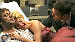 ![]() Izzie Stevens crying on Denny Duquette, as Alex Karev tries to calm down the former. Stevens's dress was a source of critical analysis. | |