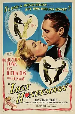 Lost Honeymoon is a 1947 American screwball comedy film directed by Leigh Jason and starring Franchot Tone, Ann Richards and Tom Conway. The working title of the film was Amy Comes Across.[3]