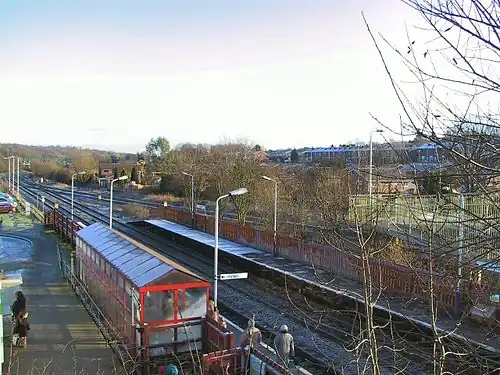 ![]() Lostock station (2005), looking east. The Wigan lines on the right (with no platforms) can be seen joining the main line in the distance. | |||||