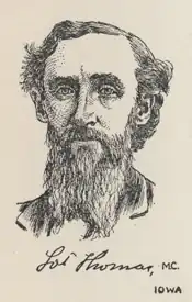 Born on a farm near Markleysburg, Pennsylvania to Christian and Susan Fike Thomas,[1] Lot Thomas attended the public schools in Pennsylvania, then Vermillion Institute in Hayesville, Ohio. He moved to Iowa in 1868. After teaching school in New Virginia, in Warren County, he attended the University of Iowa College of Law. He was admitted to the bar in 1870. That year he moved to Sioux Rapids in Buena Vista County, Iowa, where he started his law practice. When the county seat was moved to Storm Lake, Thomas also moved there.[2]
