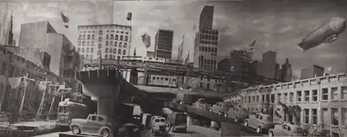 Osterburg extended these themes with "Yesterday's Cities of Tomorrow," seeking to capture the mythical, longed for, and sometimes fantastical New York City imagined by Ellis Island immigrants or encountered in old books and movies.[41][57] The series mixes history (old locomotives, zeppelins, mid-century cars, expressway on-ramps), fantasy, and familiar landmarks (the Brooklyn Bridge and Flatiron Building, elevated trains) in photogravures such as Twilight, 1984 (2011) and Night (2012); Zeppelins docking at Grand Central (2013), described in The New Criterion as a remarkable "steampunk" image, was featured with its playful model in the MTA Arts show "On Time/Grand Central at 100."[58][59][60][61]