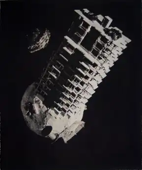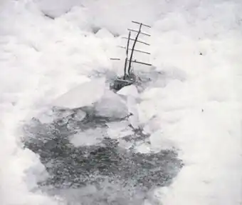 In the mid-1990s, Osterburg moved into sculpture and photography via the wire models he had built for his paintings.[42][39] Over the next decade, he began fleshing out incomplete but skillfully constructed miniatures out of found materials, which he staged, photographed, and printed as black-and-white photogravures.[33][7][1] His earlier photogravures combine drama, whimsy and the mythic, depicting sea vessels in various states (Fram, 1997; Cargo Ship in Storm, 2002; Safe Harbor and Wreck of the Somerset, 2004), rickety, rustic structures (Thorn Boat Marina, 1998; Vietnamese Waterwheel, 2001), and interiors carved from bits of soap (Soap Library, 2001).[33][38][43][42]