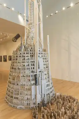 Two series celebrating the printed word and cultural diversity grew out of A Bookmobile for Dreamers. "Library Dreams" consists of photogravures of child-like wonder—bookmobiles, a locomotive bursting into a library (referencing Magritte's Time Transfixed), or Literary City (2013), a book city floated on the East River and shot in scale against the Manhattan skyline.[30][41] "Babel" includes photogravures, a stop-motion video, and the giant (28 feet in a 2017 installation) model Tower of Babel; influenced by Bruegel's The Tower of Babel works, the spiraling sculpture built entirely from old books (in 25 languages, found in Brooklyn) dwarfs a model modern metropolis and is surrounded by floating dirigibles and satellites.[58][4][52]