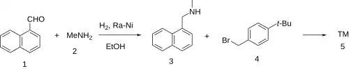 Reductive amination of 1-naphthaldehyde (1) with methylamine (2) gives the intermediate secondary amine (3). Alkylation of this with p-tert-butyl benzyl bromide (4) yields the tertiary amine butenafine.[3][4][5]