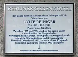 A plaque commemorating Reiniger at her former home on Knesebeckstraße in Berlin, Germany.