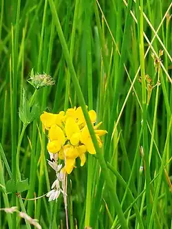 Lotus pedunculatus occurs in a wide range of neutral, damp, open habitats, including certain fen-meadow plant associations such as Juncus subnodulosus-Cirsium palustre fen-meadow habitat.[5]
