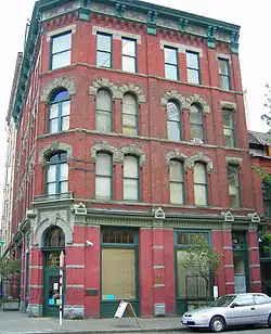 She established the young city's most refined parlor house at the southwest corner of 3rd Avenue South and South Washington Street,[2] "a discreet establishment for the silk-top-hat-and-frock-coat set to indulge in good drink, lively political discussions and, upstairs, ribald pleasures -- all free to government representatives."[3] Speidel, in his history of early Seattle Sons of the Profits, remarks that in her heyday "More city business was transacted at Lou's than at City Hall."[12] The building survives as the Washington Court Building, 221 South Washington Street[13] and houses, among other things, part of the Union Gospel Mission.[14] There are interior vestiges of the original brothel in the form of a stairway leading up to a second-floor landing from which former bedroom spaces are accessible.