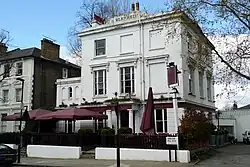 The road was laid out in the 1840s and 1850s, and takes its name from the Scottish landscape gardener John Claudius Loudon.[1] Initially only the southern section was named Loudon Street with the northern stretch known as Bridge Road after the road bridge carrying it across West Coast Main Line. By 1878 the whole street was known by the name and when a new railway station opened that year it was named after the street. Located at the entrance to the lengthy Primrose Hill Tunnel, it was known as Loudoun Road until its renaming as South Hampstead station in 1922.[2]