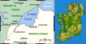 Lough Foyle, sometimes Loch Foyle[2] (Irish: Loch Feabhail, meaning 'Feabhal's loch'[3] or "loch of the lip"[4]), is the estuary of the River Foyle, on the north coast of Ireland. It lies between County Londonderry in Northern Ireland and County Donegal in the Republic of Ireland. Sovereignty over the waters has been in dispute since the Partition of Ireland.