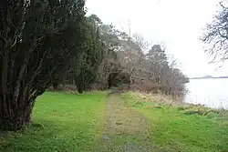 Turn right with the path and you pass the crannóg in Lough Rynn as you walk towards the Boathouse.