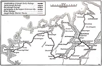 In 1883, the 3 ft (914 mm) narrow gauge Letterkenny Railway between Cuttymanhill and Letterkenny was opened and the L&LSR connected with it by reopening the Tooban Junction - Cuttymanhill section of its Farland Point line.[5] The L&LSR worked the Letterkenny Railway, and in 1885 it converted its track from 5 ft 3 in (1,600 mm) gauge to 3 ft (914 mm) narrow gauge to enable through running.[5] In 1887, ownership of the Letterkenny Railway passed to the Irish Board of Works,[4] which continued the agreement by which the L&LSR operated the line.