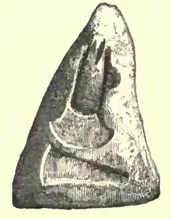 There was a Bronze Age human settlement at Lough-Scur c. 4,000 – c. 2,500BC. The "Lough-Scur Stone Mould" is a triangular coarse block of white sandstone found on the Lough-Scur crannog,[21] bearing matrices for casting Copper and Bronze flat axes or spear-heads,[22][23] and containing three moulds, one flat axe and one looped Palstave on obverse, with one flat axe on reverse.[24][25] These were fashioned before the lake dwellers became familiar with the use of Iron sourced from Sliabh an Iarainn for example.[26] The illustration shows the side with moulds for a plain Celt (tool) 7.5cm long and for a Celt 10cm long with cross strop and ring.[27] The mould is part of the Royal Irish Academy's Collection.