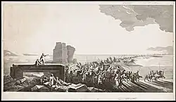 As the godson of the Marquis Louis-François de Gallifet, owner of the Château d'Azay-le-Ferron, where Cassas was born,[2] his artistic education was very eclectic. He studied in Tours and Paris before traveling to Rome.[3] His teachers included Joseph-Marie Vien (1716–1809), a Neo-classical painter and teacher to Jacques-Louis David (1748–1825), Louis Jean François Lagrenée the younger (1739–1821), as well as Roccoco painters such as Jean-Baptiste Le Prince (1734–1781).[1] In 1778 Cassas went to Rome, Venice, Naples and Sicily where he spent the first years of his youth in the study of ancient monuments. A commission by "une societe d'amateurs des beaux arts" in 1782 took him from Istria to southern Dalmatia, to make a series of illustrations of the antiquities on the east Adriatic coast. These drawings were later published as engravings and reproduced to 69 copperplate printings in his 2-volume book Voyage pittoresque et historique de l'Istrie et de la Damatie, published in Paris in 1802. The original watercolors are at the Victoria and Albert Museum in London.[1]