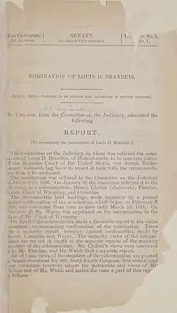 - ^ "May Let Senate Deal with Brandeis Case; Judiciary Committee Practically Decides to Report on Nomination Without Recommendation. COURSE MEANS LONG FIGHT Administration Leaders Are Confident That the Nomination Will Eventually Be Confirmed". The New York Times. May 16, 1916. Retrieved August 25, 2022.