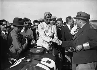 Employed as a dancer after World War I, Chiron's racing career started in 1923, after a rich American woman he was friends with bought him a second hand Bugatti Brescia.[4][1] He started in local hillclimbs,[5] and moved to Grand Prix racing in 1926, after getting a Bugatti T35, and befriending rich industrialist Alfred Hoffman.[1] He won the Grand Prix du Comminges that year, at Saint-Gaudens, near Toulouse.[6]