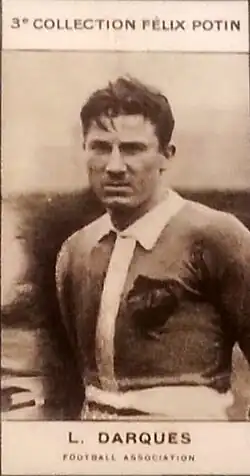 Together with Émile Fiévet, Paul Landauer, and Jules Dewaquez, he was a member of the great Pantin team of the early 1920s, which won the Ligue de Paris in 1921, the Coupe de Paris in 1923, and which reached another Coupe de France final in 1921.[12] On many of these finals, their opponent was Jules Rimet's Red Star, such as the 1921 cup final, which ended in a 2–1 loss; Darques nearly scored his third goal in as many finals when he fired a shot into an empty net, but Red Star's full-back Lucien Gamblin stopped the ball with both hands, and Dewaquez then missed the subsquent penalty.[13][14] In the following year, they faced Red Star in the final of the 1922 Ligue de Paris, in which he won a penalty after being violently pushed by Red Star full-back Maurice Meyer, but then failed to convert it in an eventual 3–0 loss.[15] Two years later, the 1922–23 season was summed up as a duel between both clubs, already presented in the press as "eternal rivals", and in the final of the 1923 Coupe de Paris, Darques scored his side's second goal to seal a 2–0 victory over Red Star.[16]