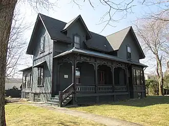 The Louis Kotzow House is a historic house in Pawtucket, Rhode Island. It is a 1+1⁄2-story wood-frame structure, laid out in an L shape. Its exterior is visually busy, with numerous projecting dormer and gable sections, and elaborate woodwork, including bracketed eaves and applied Stick style woodwork on a projecting bay section. Its porch has a delicate jigsawn railing, with a wooden frieze and decorative arches above. The house, built c. 1875, is one of two (the other is the nearby Scholze–Sayles House) built by the German Land Cooperative Association, which sought to create a German-speaking enclave in the area.[2]