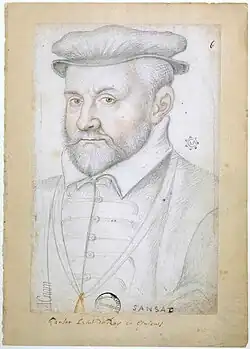 As royal authority continued to crumble with the outbreak of open civil war, Sansac asked to be relieved of his office in September 1562.[5] With François, Duke of Guise assassinated at the climax of the first war of religion, the perpetrator Jean de Poltrot was quickly apprehended. Under torture he confessed that among the Protestants, Louis, Duke of Montpensier and Sansac were particularly loathed for their persecution of the religion.[6] In the Montmorency-Guise feud that blossomed as a result of recriminations for ultimate responsibility for the assassination, Sansac aligned himself with the Guise, making an oath in 1565 to violently purge France of heresy and avenge the death of Guise up to the fourth generation.[7]