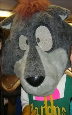 The mascot is a grey animal with brownish-red hair and wearing a green jersey with the school team's name on it. The Baron mascot is similar to the school's logo -- a warrior with a green helmet, green uniform and holding a green and gold shield and gold sword.