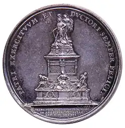 Prominent courtier François III d'Aubusson, Duke of La Feuillade planned the Place des Victoires as both a property development project and a celebration of Louis XIV following the Treaties of Nijmegen, which in the late 1670s had put an end to his previous career as a military leader. He formed the plan in 1681 and purchased part of the grounds in 1684, the rest being acquired for the same purpose by the City of Paris.[1] While not much is known about the details of the planning process, it is probable that Louis XIV's entourage, if not the king itself, was involved in the definition of its program of monarchical glorification, so that the monument eventually appears as a hybrid of private initiative and official project.[3]: 10 The iconographic program echoes that of the ceiling of the Hall of Mirrors in Versailles and includes several of the same episodes, even though the depictions on the Victory Monument make less systematic use of allegory.[3]: 31-32