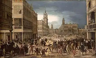 Under the influence of Italian models, he employed a palette that was innovative for Flanders at that time: half tones, ochre-yellow, Veronese green and Burgundy red. His depiction of buildings shows him to be concerned with fine detail and very skillful at presenting perspective.[6] In his architectural scenes the pictorial space and the settings draw direct inspiration from Hans Vredeman de Vries's designs in the publications Scenographia (1560), Perspective (1604), and Architectura (1507).[2] His cityscapes often depict Italian cities bustling with people engaged in festivities or carnivals; for instance, he painted city views of Rome and Venice and a few views of the Escorial.[5]