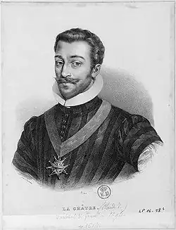 His allegiance to the prince was to be temporary however, Henri keen to win him over. In 1584 he was made a chevalier de l'Ordre de Saint-Michel, the second highest order of French chivalry. This was followed by elevation as a gentilhomme de la chambre du roi the following year.[6] In the final years of Henri's reign he would become lieutenant of the royal hunt and governor of the town and citadel of Dourdan.[2]