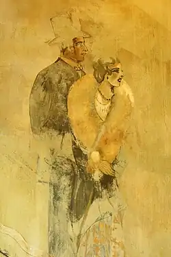 The Woos first went public about the murals February 6, 2018, six days before reconstruction began.[1] The murals on the staircase depict elegantly dressed men and women, some of them African American, some White, and some (in the words of building co-owner Anita Woo) "racially ambiguous."[2] Other murals, also found during demolition and preserved as part of rehabilitation,[17] depict "a peacock, a vase of flowers, and hanging paper lanterns surrounded by bamboo."[1] Various precautions were taken to preserve and restore these murals.[2] It is uncertain who created the murals, although the evidence points toward either Ted Tagholm or Louella Tagholm. They were children of the building’s original owners (who owned it in the relevant period), and both were commercial artists.[17]