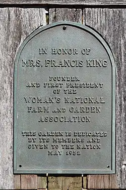 In 1914, she helped to found the Women's National Agricultural and Horticultural Association, which two years later changed its name to the Woman's National Farm & Garden Association (WNF&GA). King, who served as the first president of the WNF&GA from 1914 to 1921, saw horticulture and gardening as a means for women to establish themselves in the world; under her guidance, the WNF&GA established scholarships for women to pursue academic study of agriculture, botany, and landscape architecture.[3][6][7][2][10] During World War I, the WNF&GA and GCA helped organize the Woman's Land Army of America: 15,000 so-called "farmerettes" worked in agriculture, replacing men called into military service. For her role in these efforts, King was awarded the National War Garden Commission’s bronze medal.[3]