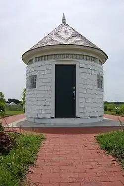 The Little Round House was originally an addition to a front porch for a Victorian-style house in the nearby town of Paola, and was called such because it was indeed round in shape. Because of increased truck traffic from Missouri on K-68 through town, Louisburg was contacted by the State of Kansas about needing an inspection station. As a solution, the Little Round House was moved to Louisburg in the 1930s to serve as a border checkpoint office. As years passed, the Little Round House became a home to a variety of small businesses, and had been used as temporary housing during World War II.[7] The shape and size aided in it becoming a landmark to Louisburg.[8] In 2005, The Little Round House was moved from its original location to the Louisburg City Lake, and has been restored by the community due to its historical value to the town.[7]