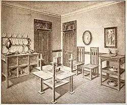 In 1909, Brigham published a book of her designs for building furniture entirely out of packing crates entitled Box Furniture. Illustrated with line drawings by the interior designer Edward H. Aschermann (whom Brigham had met through their mutual friend, the Viennese Secessionist architect-designer Josef Hoffmann), [4] Box Furniture was a how-to manual for a target audience of modestly skilled working-class householders. It offered dozens of different furniture plans, advice on how to select and break down crates, instruction in basic carpentry, and a list of necessary tools. Designs were grouped into suites for specific rooms, as well as organized along a trajectory of increasing complexity.[2] Brigham also offered complementary advice on curtain materials and overall color schemes.