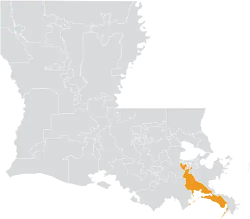 The district overlaps with Louisiana's 1st and 2nd congressional districts, and with the 54th, 83rd, 84th, 85th, 87th, and 105th districts of the Louisiana House of Representatives.[4]