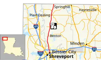 LA 3 connects Bossier City, the largest city in Bossier Parish, with the town of Benton, the parish seat. Apart from the interchange with I-20 and US 71 at its southern terminus, LA 3 also connects to I-220, the northern bypass of Shreveport and Bossier City. North of Benton, LA 3 passes through Plain Dealing, where it intersects LA 2, Louisiana's northernmost cross-state route.