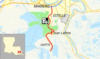 Louisiana Highway 45 (LA 45) is a state highway located in Jefferson Parish, Louisiana. It runs 22.08 miles (35.53 km) in a north–south direction from a dead end at Bayou Barataria in Lafitte to a junction with LA 18 in Marrero.