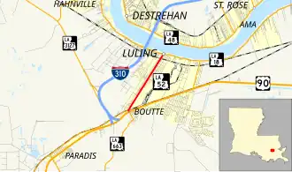 The route serves as the main north–south thoroughfare of Luling, located on the west bank of the Mississippi River, and connects it with US 90 at Boutte.