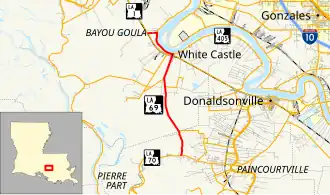 In the original Louisiana Highway system in use between 1921 and 1955, the modern LA 69 was part of four separate state routes, as follows: State Route 999 from the Assumption–Iberville parish line to Samstown; State Route 253 from Samstown through White Castle; State Route 30 along the Mississippi River to Bayou Goula; and State Route 261 west from Bayou Goula.[8] The portion of LA 69 traversing the swampland south of Samstown did not exist during much of the pre-1955 era, although it had been planned as part of Route 999 since 1930 and was included in the original legislative description of that route.[9] The highway was completed as far south as the parish line sometime after 1937, allowing a connection with Grand Bayou via what is now LA 996 (former State Route 566).[10] The portions of the pre-1955 routes now followed by LA 69 remained largely the same otherwise prior to the 1955 Louisiana Highway renumbering. The route was entirely gravel surfaced during this time except for a brief section of pavement through downtown White Castle.[8]