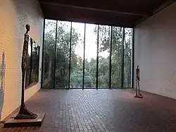 The architecture of the Louisiana is considered to be an instrumental part of the museum experience, and has been used as a point of comparison to other buildings.[45] Architects Vilhelm Wohlert and Jørgen Bo were contacted by Knud W. Jensen to design the new museum building. At first Jensen had contacted Jørn Utzon to design the museum, who himself owned a house in nearby Hellebæk. However, as Utzon was busy with working on his later successful design for the Sydney Opera House, he declined the offer.[27] Wohlert and Bo's study of the property over the course of several months resulted in the first version of the museum consisting of three buildings connected by glass corridors, which opened in 1958 and is designated as the Nordfløj (North Wing).[46] A clear source of inspiration for this building was the Kings Road House by Rudolph Schindler in Los Angeles, along with Richard Neutra's Bailey House in Pacific Palisades.[27] The building was subsequently expanded with the addition of the Vestfløj (West Wing) in 1966 and again in 1971, collectively adding two more floors.[46] The change in architectural direction with the expansion of the Sydfløj (South Wing) in 1982, is largely the result of the increasing size and dimensions of the works of art in the exhibitions. According to Jensen, large portions of the permanent collection had to be stored away for most of the year, as to make room for the temporary exhibitions; the much larger spaces of the South Wing are in that sense "tailor-made for the international collection", in Jensen's own words.[27][29]