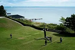 The grounds around the museum contain a landscaped sculpture garden. It consists of a plateau and ground that slopes towards the Øresund and is dominated by huge, ancient specimen trees and sweeping vistas of the sea. It contains works by such artists as Jean Arp, Max Ernst, Max Bill, Alexander Calder, Alicja Kwade, Henri Laurens, Joan Miró and Henry Moore. The sculptures are either placed so that they can be viewed from within, in special sculpture yards or independently around the gardens, forming a synthesis with the lawns, the trees and the sea.[50]