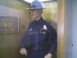 Sergeants act as assistant shift commanders or duty officers. A sergeant is generally considered to be a first-line supervisor in most units.[16] Sergeants wear three yellow inverted chevrons on each sleeve under the State Police patch. Emergency Services Technicians and Technical Support Officers hold the same pay grade as a Sergeant, but they do not hold any supervisory authority or responsibility. They work in the Emergency Services and Technical Support sections, respectively. These officers wear a gold-colored metal bar that is inlaid with a single blue enamel bar on each epaulet. | |