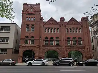 Made of red sandstone and bricks, it was designed in a Richardsonian Romanesque design. The building has a five-story drying tower that originally supported an additional two-story belfry tower. The belfry tower was used as a lookout to survey the surrounding area for signs of fire and housed a fire warning bell. The belfry tower was later removed from the building. The facade of the building features relief sculptures of Benjamin Bache, the fire chief at the time, and Emile Bourlier, who was a bookkeeper for the sinking fund. Three large arches located at the base of the structure once served as doorways for the horse-drawn fire engines housed in the building; the second floor was originally used as offices and sleeping quarters for the firemen.[2]