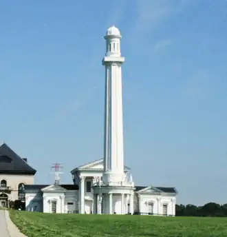 The Louisville Water Tower, located east of downtown Louisville, Kentucky, near the riverfront, is the oldest ornamental water tower in the world, having been built before the more famous Chicago Water Tower.[2] Both the actual water tower and its pumping station are a designated National Historic Landmark for their architecture. As with the Fairmount Water Works of Philadelphia (designed 1812, built 1819–22), the industrial nature of its pumping station was disguised in the form of a Roman temple complex.