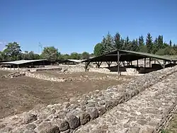 The excavation work was conducted by the Ephorate of Byzantine Antiquities of Thessaloniki.[2] They started in 1993, ended in 1997 and were financed by the Greek railway company OSE.[3] The railway line divides the excavation site diagonally. The western defense tower and part of the wall are outside the accessible terrain.[4]
