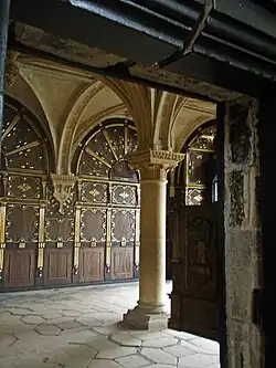 The masque was staged in what was called the "little castle" at Bolsover, a then-recent (Jacobean) construction.[7] The pillared hall or parlour was furnished with five brilliantly colored paintings on the theme of The Senses.[8] Jonson alludes to the paintings in his text,[9] and their arrangement in the Neoplatonic hierarchy: