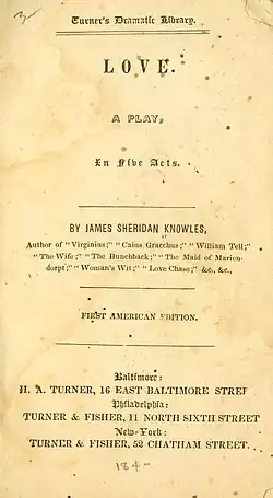 Love (also known as The Countess and the Serf) is an 1839 play by the Irish writer James Sheridan Knowles.[1] It premiered at the Theatre Royal, Covent Garden on 4 November 1839 with a cast that included Charles Selby as Prince Frederick, James Vining as Sir Rupert, Alfred Wigan as Sir Conrad, William Payne as Stephen, Ellen Tree as Countess, Emma Brougham as Empress and Lucia Elizabeth Vestris as Catherine. Knowles was paid six hundred pounds for the work by the management of Covent Garden.[2] Mary Shelley praised the play for its "inspiring situations founded on sentiment and passion".[3] It went on to enjoy success in the United States where it became part of the repertoire, being performed at the Broadway Theatre in New York many times in the 1850s.[4] It was celebrated by abolitionists who cheered its anti-slavery theme of a serf falling in love with a countess despite her father's disapproval and the threat of execution.[5]