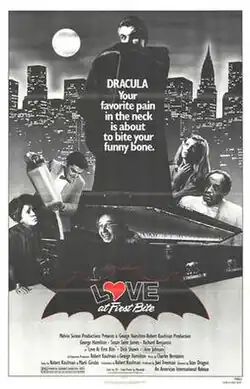 Love at First Bite is a 1979 American comedy horror film directed by Stan Dragoti and written by Robert Kaufman, using characters originally created by Bram Stoker.[3] It stars George Hamilton, Susan Saint James, Richard Benjamin, and Arte Johnson.[3] The film's plot details the misadventures of Count Dracula in New York City while pursuing the object of his romantic desires, fashion model Cindy Sondheim, only to find himself a fish out of water in the Big Apple and having to contend with the inimical attentions of Cindy's would-be boyfriend.