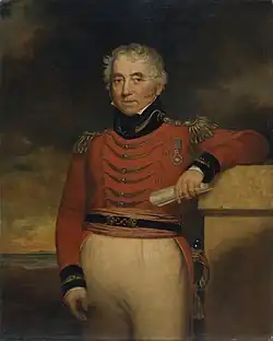 The Vice Admiral fought in North America for the British, capturing number of coasters as Commander of HMS Plantagenet, and joined the Chesapeake campaign. He served under Major General Edward Pakenham, the brother-in-law of the Duke of Wellington, and brought back the bodies of Pakenham and General Edward Gibbs to England.[15] He was also a Royal navy Admiral during the Glorious First of June, the Anglo French War, the Invasion of France (1795), and the Napoleonic Wars against Napoleon Bonaparte, commanding HMS Racoon (1795) and other vessels.[15][16]