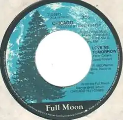"Love Me Tomorrow" is a song written by Peter Cetera and David Foster for the group Chicago and recorded for their album Chicago 16 (1982),[2] with Cetera singing lead vocals. The second single released from the album, it reached No. 22 on the U.S. Billboard Hot 100 chart[3] and No. 8 on the adult contemporary chart.[4] Songwriter Cetera, a member of the American Society of Composers, Authors and Publishers (ASCAP), won an ASCAP Pop Music Award for the song in the category, Most Performed Songs.[5]