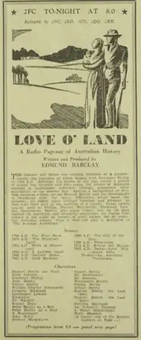 Love o' Land is a 1934 Australian radio play by Edmund Barclay. It was described as a "cavalcade of Australian history" and involved a family whose adventures coincided with ten scenes in Australian history from 1788 onwards.[2]